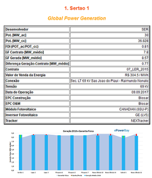 The project is located in the Brazilian town of São João de Piaui, with a nominal power of 30 MW. During 2018, the project has achieved an average capacity factor of 28.6%, leading in several months the ranking of the most efficient plants along with another of the projects developed by Ser Energía, Sobral 1. Both Projects were acquired by the Spanish company GPG, Global Power Generation, a subsidiary of Naturgy, after winning the A-2 auction in 2015, and are in operation since 2017. The construction of the two projects was made under the specifications of the engineers of Ser Energía.
